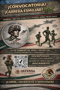 Para festejar el mes del ejército y fuerza aérea Mexicanos realizaran una carrera pedestre, el próximo 22 de Febrero a las 9 de la mañana en la ciudad deportiva de la capital, en la que se instalan módulos de las funciones de las fuerzas armadas, la inscripción es gratis, solo se necesita escanear el código QR y se les obsequiará su playera y medalla conmemorativa.