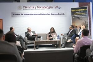 En el encuentro se compartieron estrategias de colaboración entre sectores para impulsar el desarrollo científico, académico y productivo del país. La charla fue moderada por el Mtro. Ulises Alejandro Fernández, de la SIDE, y contó con la participación de la Dra. Silvia Amaya Llano, rectora de la Universidad Autónoma de Querétaro; en representación del Ing. Alberto Terrazas asistió el Lic. Luis Oliver Torres García del sector empresarial; y la Dra. Leticia Myriam Torres Guerra del CIMAV.